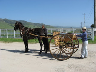 The moment of truth (if a horse has ever done this before) is putting the cart on the harness. She was a little watchy, but good. The wind was BLOWING and she was very good considering.