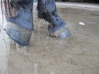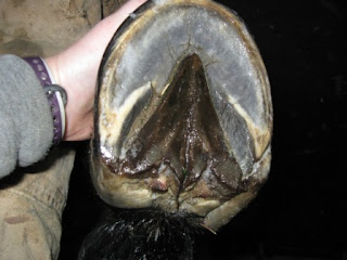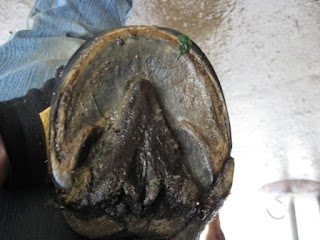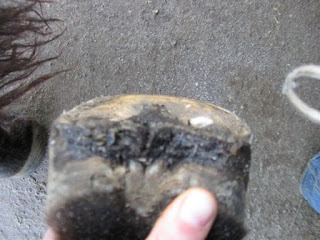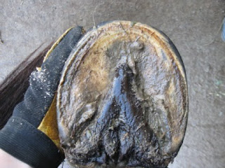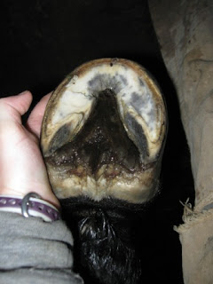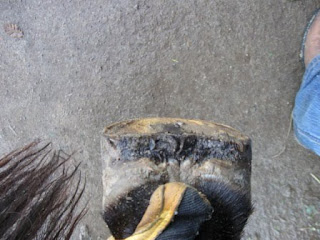 Yes, you are seeing that correctly. Very odd injury – it goes through her hoof, all the way up the back of her pastern. It doesn’t seem to cause her any discomfort and I’ve never had an issue with it. The ironic thing is that of all 4 feet, I consider that one the furthest along in terms of convacity, frog development etc!