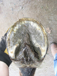 ~2 1/2 weeks ago, she was a bit ouchy on a trail ride (sans boots) so I poked and prodded and voila! All sorts of sole and frog began to flake off. There is what I had: