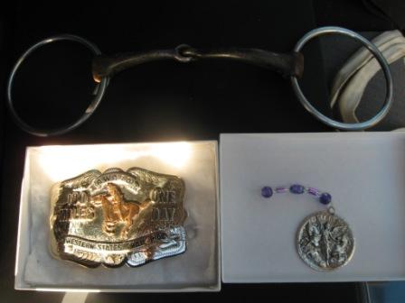 If there IS a picture – what you are seeing is the 3 objects that will go into the shadow box – the buckle, my tevis angel, and Minx’s bit. It was her favorite bit and I can’t imagine using it on another horse – and there’s no reason to because it was a cheap enough bit I can just buy another one if I needed it.