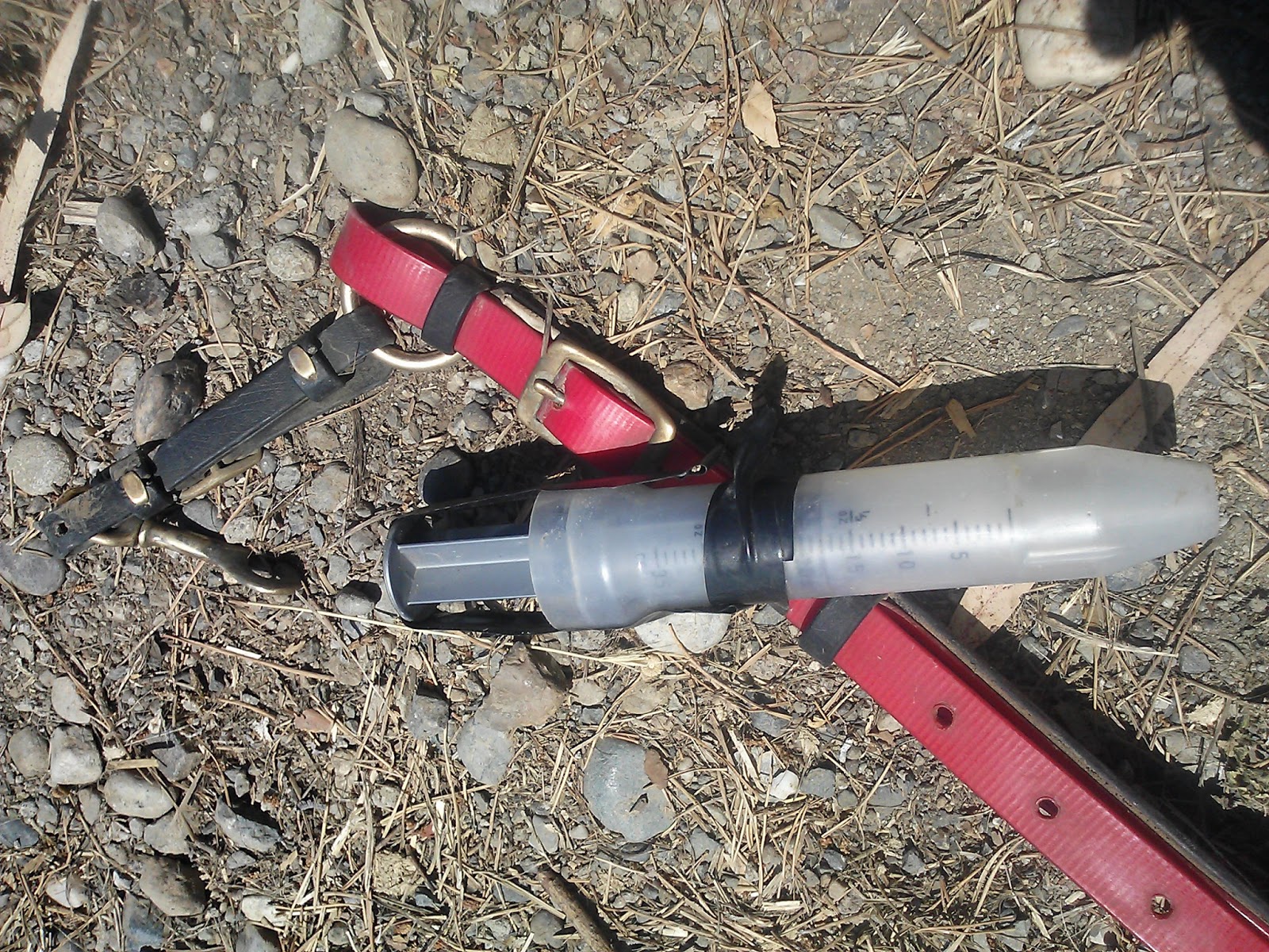I think that with the pictures, this is self-explanatory. Using electrical tape I taped the plastic holder to the breast collar, I then inserted the syringe into the holster, and used another piece of electrical tape across the top of it to hold it in.
