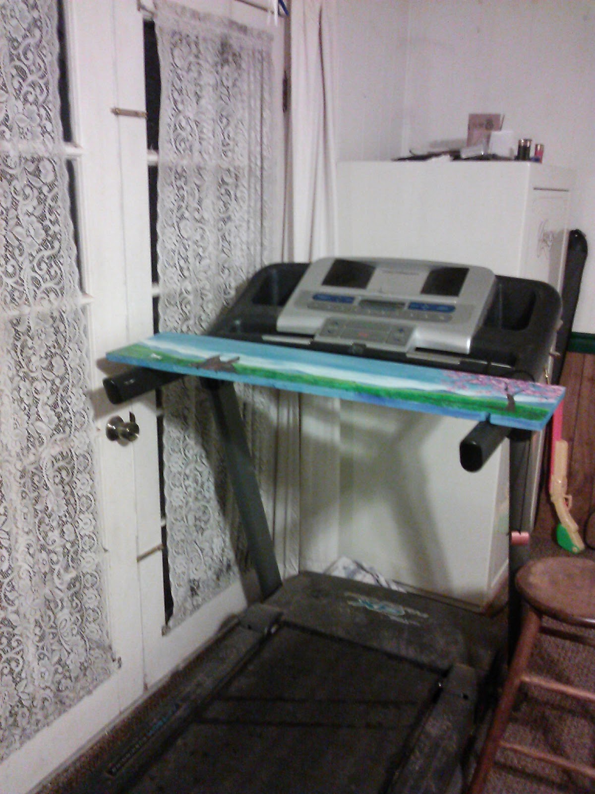 […] arms of the treadmill were level and happened to be at the exact height I needed for typing. So, I found a board that spanned the arms and was a good width. I then had a creative family member pain a trail scene on it for me “just because”. […]